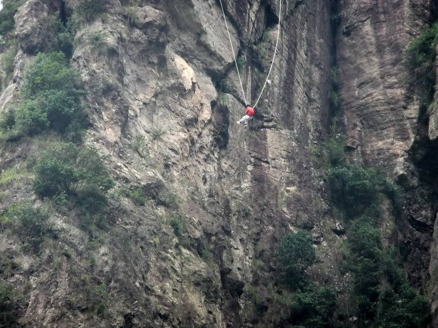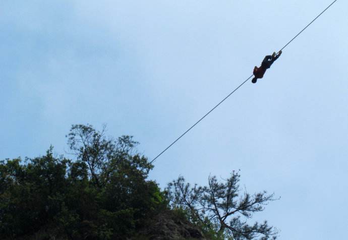 看完飞渡表演,继续往山上爬,终于到了神雕侠侣中的拍摄点之一“断肠崖”,这里还有自带玻璃破碎音效的玻璃栈道,有些恐高的游客扶着岩石颤抖着双腿,好不容易才走过。